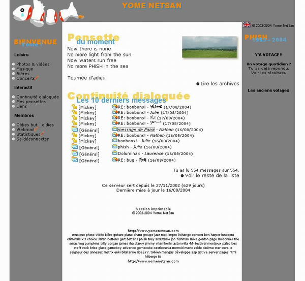 musique photo vidéo bière guitare piano chant groupe jazz-rock impro échange concert ben harper innocent criminals k's choice sarah bettens gert bettens phish trey anastasio jon fishman mike gordon page mcconnell vida blue the smashing pumpkins billy corgan james iha d'arcy jimmy chamberlin astonvilla -M- fred.k festival montjoux paleo bex staff rock brise glace gameboy advance nintendo ds gamecube castlevania metroid mario zelda polarium générateur puzzle décryptage code cinéma star wars le seigneur des anneaux matrix enki bilal anne rice j.r.r. tolkien mangas développe asp active server pages html héberge iis yomenetscan.net asp.net